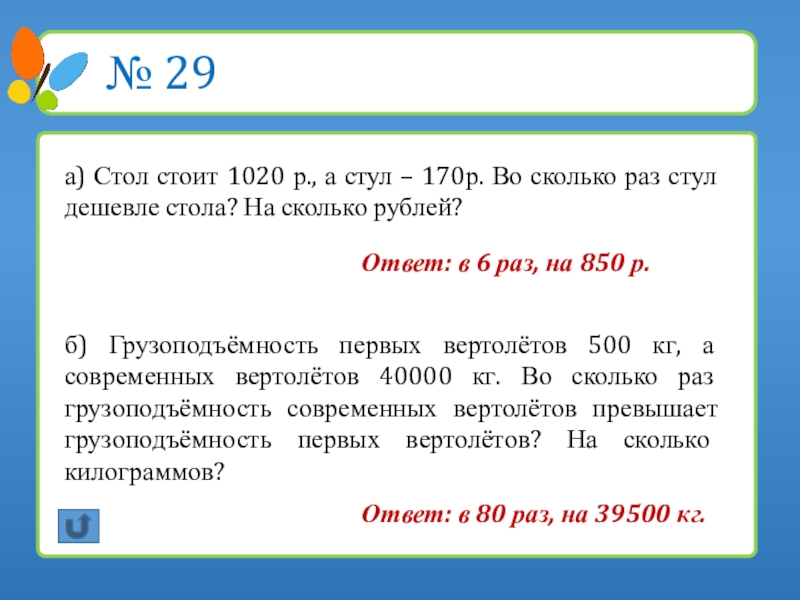 б) Грузоподъёмность первых вертолётов 500 кг, а современных вертолётов 40000 кг. Во сколько раз грузоподъёмность современных вертолётов превышает грузоподъёмность первых вертолётов? На сколько килограммов?
