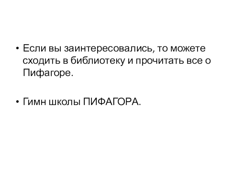 Если вы заинтересовались, то можете сходить в библиотеку и прочитать все о Пифагоре.Гимн школы ПИФАГОРА.