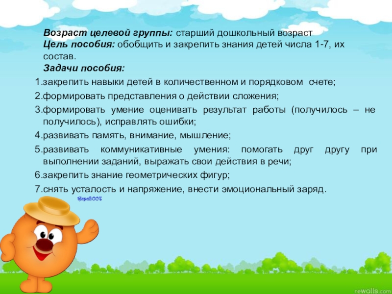 Возраст целевой группы: старший дошкольный возрастЦель пособия: обобщить и закрепить знания детей числа 1-7, их состав.Задачи пособия: закрепить навыки детей в количественном и порядковом счете;формировать представления о действии сложения;формировать умение оценивать результат работы (получилось – не
