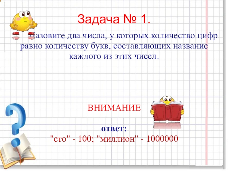 Задача № 1.        Назовите два числа, у которых количество цифр