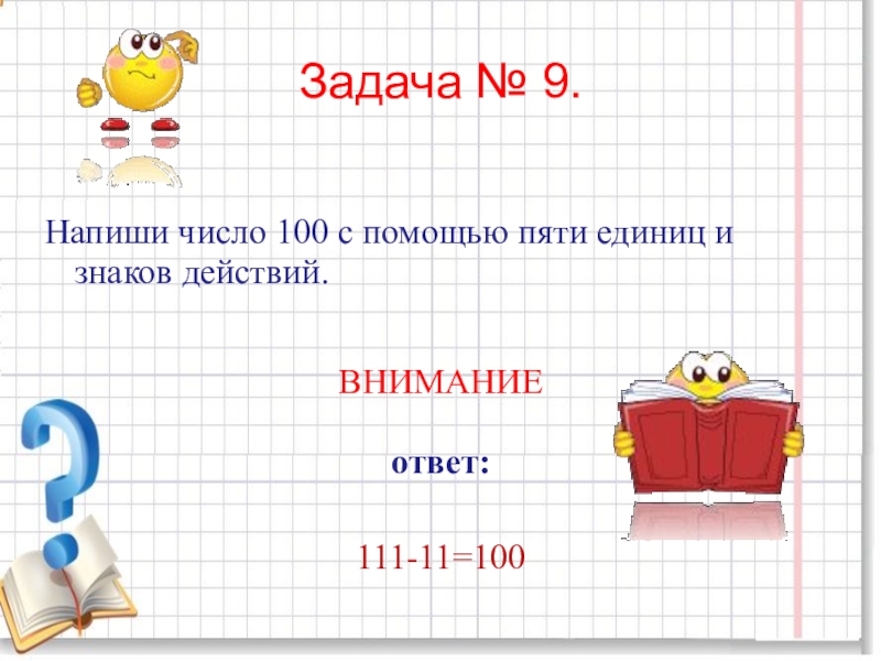 Задача № 9.Напиши число 100 с помощью пяти единиц и знаков действий.ВНИМАНИЕ ответ:111-11=100