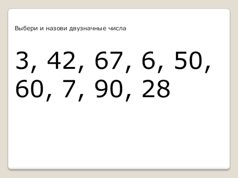 Выбери и назови двузначные числа3, 42, 67, 6, 50, 60, 7, 90, 28