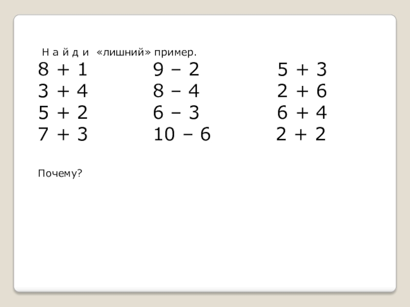 Н а й д и «лишний» пример.8 + 1     9 – 2