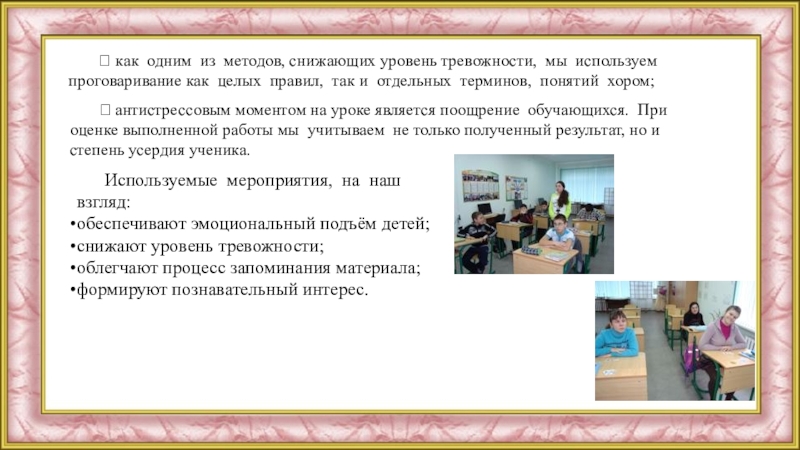антистрессовым моментом на уроке является поощрение обучающихся. При оценке выполненной работы мы учитываем не только полученный результат, но и степень усердия ученика.