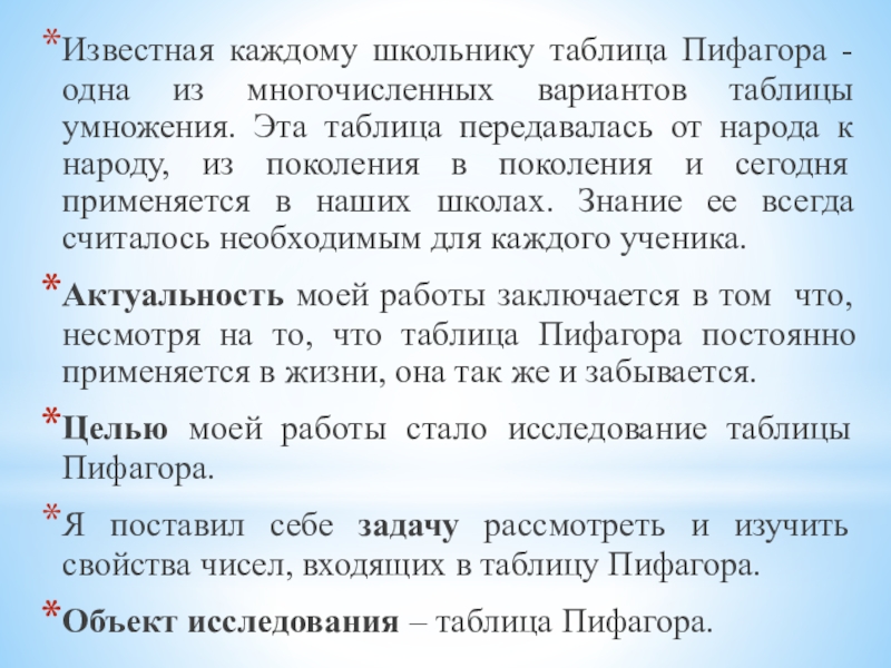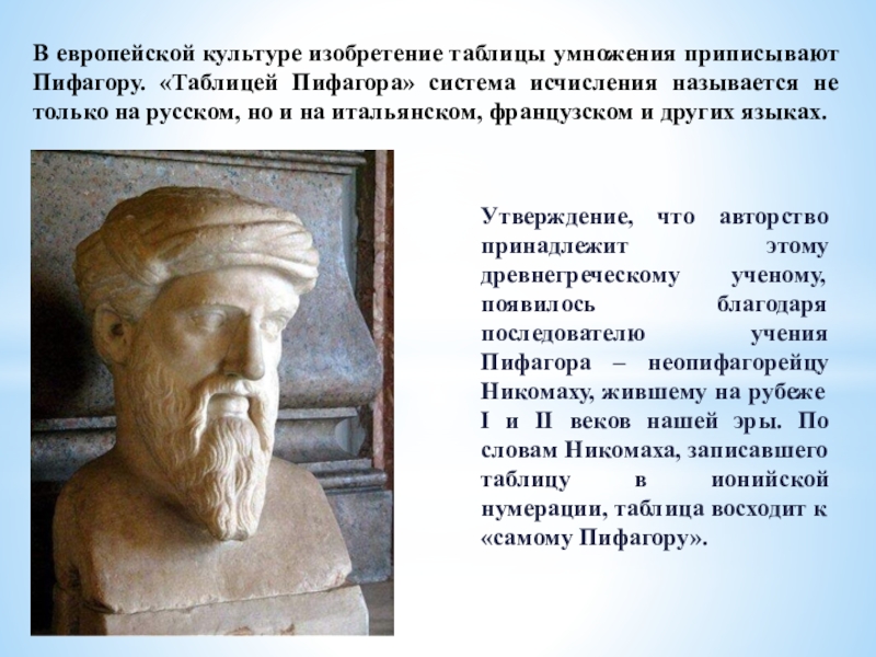 Утверждение, что авторство принадлежит этому древнегреческому ученому, появилось благодаря последователю учения Пифагора – неопифагорейцу Никомаху, жившему на рубеже I и II веков нашей эры. По словам Никомаха, записавшего таблицу в ионийской нумерации, таблица восходит к «самому Пифагору».