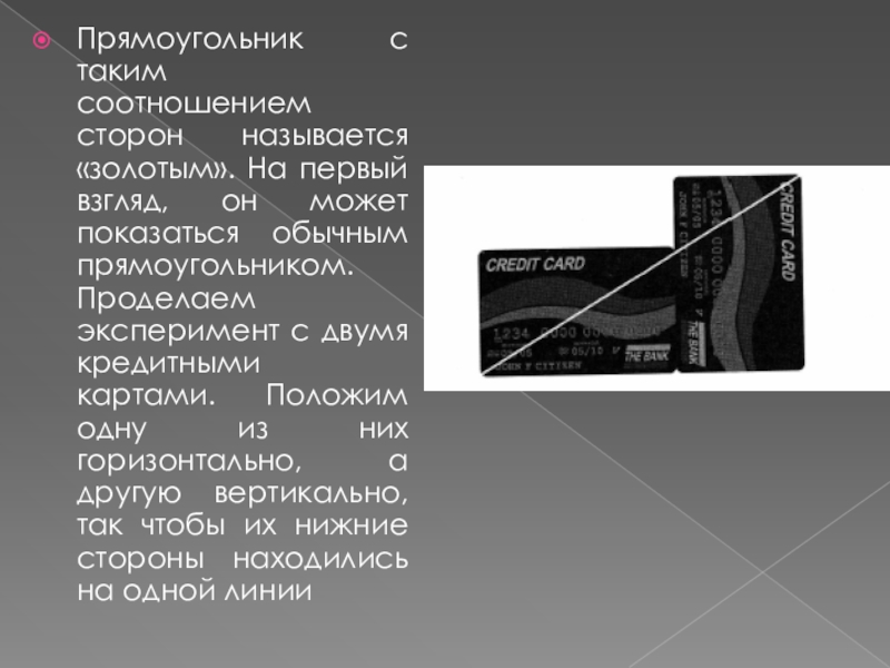 Слайд 7Прямоугольник с таким соотношением сторон называется «золотым». На первый взгляд, он