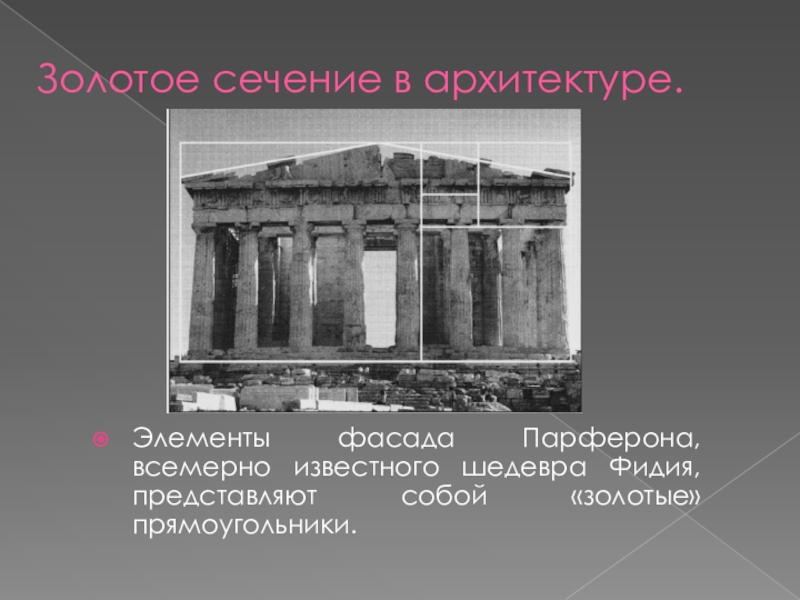 Золотое сечение в архитектуре.Элементы фасада Парферона, всемерно известного шедевра Фидия, представляют собой «золотые» прямоугольники.
