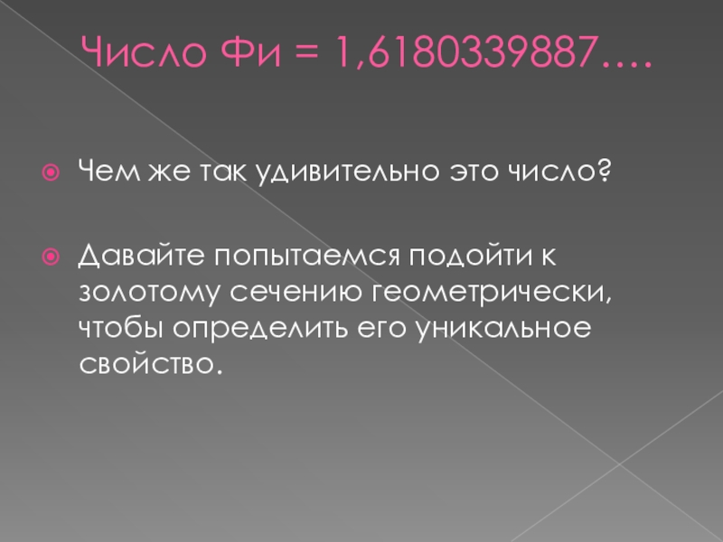 Число Фи = 1,6180339887…. Чем же так удивительно это число?Давайте попытаемся подойти к золотому сечению геометрически, чтобы
