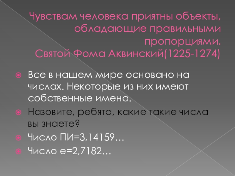 Чувствам человека приятны объекты, обладающие правильными пропорциями. Святой Фома Аквинский(1225-1274)Все в нашем мире основано на числах. Некоторые из них имеют собственные имена.Назовите, ребята, какие такие числа вы знаете? Число ПИ=3,14159…Число e=2,7182…