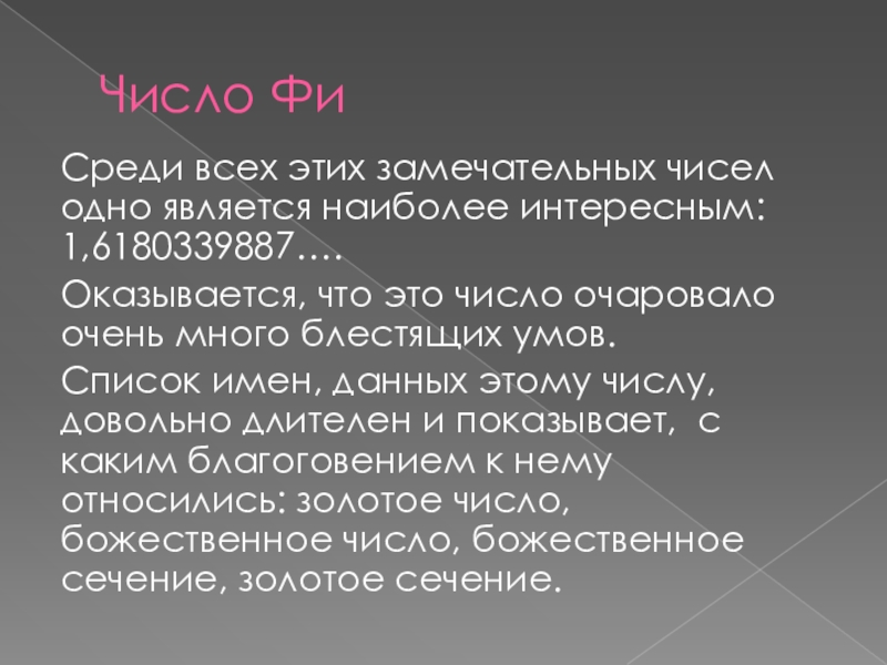 Число ФиСреди всех этих замечательных чисел одно является наиболее интересным: 1,6180339887….Оказывается, что это число очаровало очень много