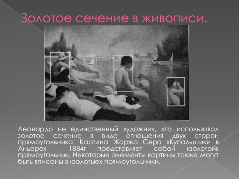 в виде отношения двух сторон прямоугольника. Картина Жоржа Сера «Купальщики в Аньере» 1884г представляет собой «золотой» прямоугольник. Некоторые элементы картины также могут быть вписаны в «золотые» прямоугольники.