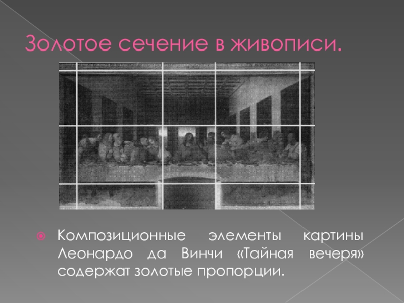 Золотое сечение в живописи.Композиционные элементы картины Леонардо да Винчи «Тайная вечеря» содержат золотые пропорции.