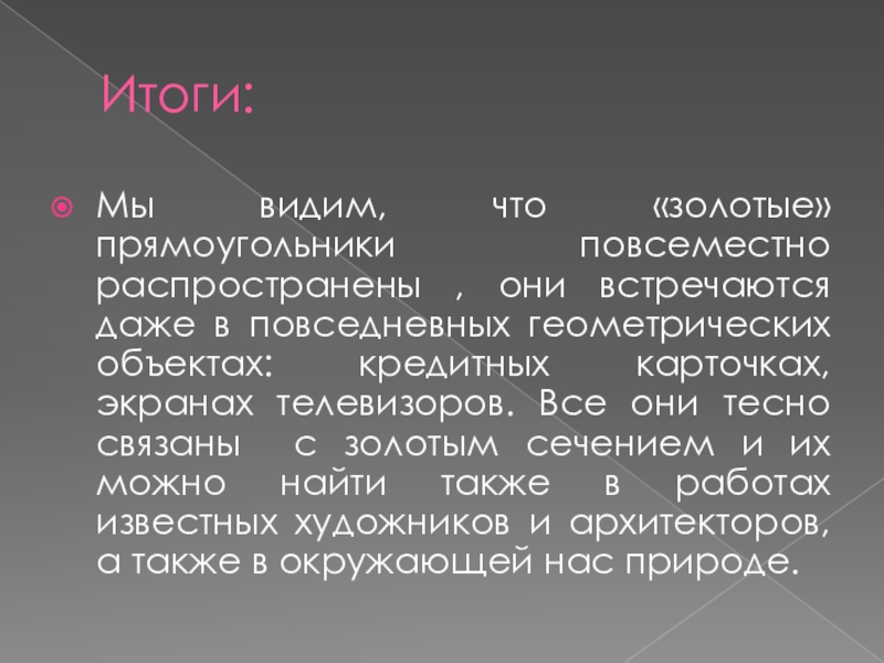Итоги:Мы видим, что «золотые» прямоугольники повсеместно распространены , они встречаются даже в повседневных геометрических объектах: кредитных карточках,