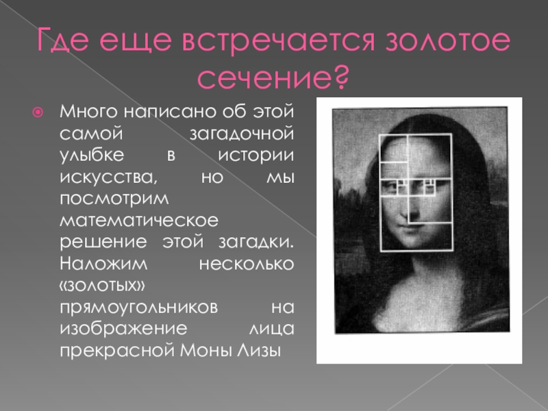 в истории искусства, но мы посмотрим математическое решение этой загадки. Наложим несколько «золотых» прямоугольников на изображение лица прекрасной Моны Лизы