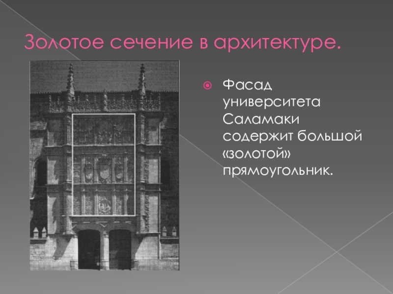 Золотое сечение в архитектуре.Фасад университета Саламаки содержит большой «золотой» прямоугольник.