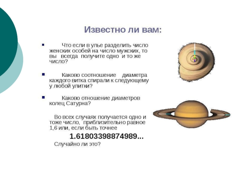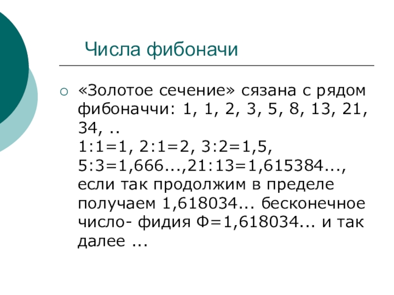 «Золотое сечение» сязана с рядом фибоначчи: 1,