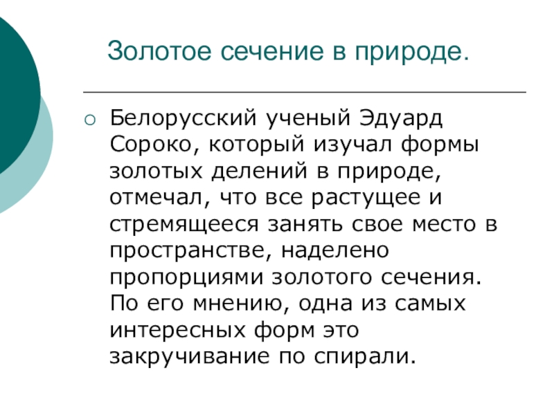 формы золотых делений в природе, отмечал, что все растущее и стремящееся занять свое место в пространстве, наделено пропорциями золотого сечения. По его мнению, одна из самых интересных форм это закручивание по спирали.