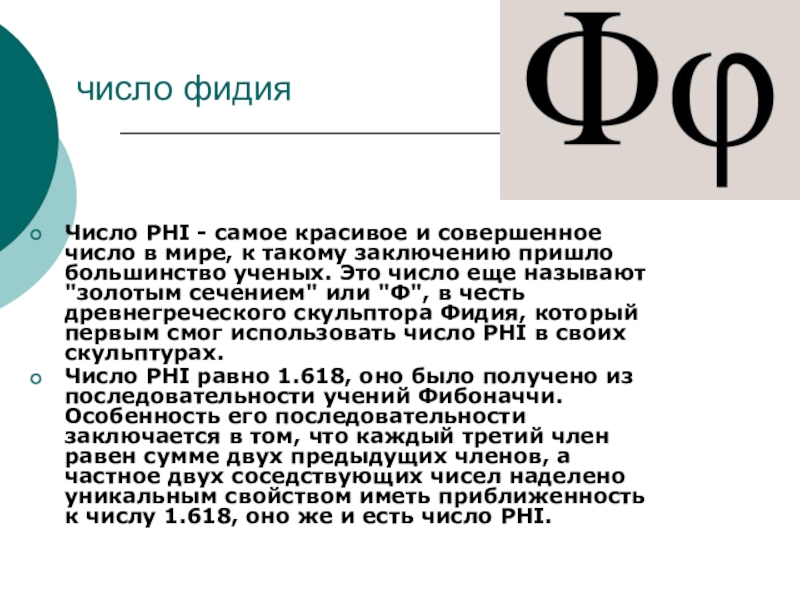 совершенное число в мире, к такому заключению пришло большинство ученых. Это число еще называют "золотым сечением" или "Ф", в честь древнегреческого скульптора Фидия, который первым смог использовать число PHI в своих скульптурах.