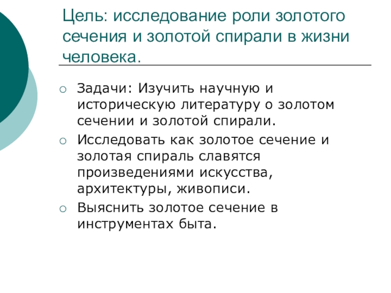 Слайд 2Цель: исследование роли золотого сечения и золотой спирали в жизни человека.