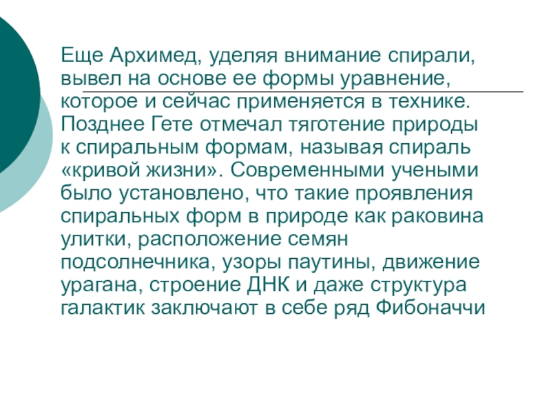 которое и сейчас применяется в технике. Позднее Гете отмечал тяготение природы к спиральным формам, называя спираль «кривой жизни». Современными учеными было установлено, что такие проявления спиральных форм в природе как раковина улитки, расположение семян подсолнечника, узоры паутины, движение урагана, строение ДНК и даже структура галактик заключают в себе ряд Фибоначчи