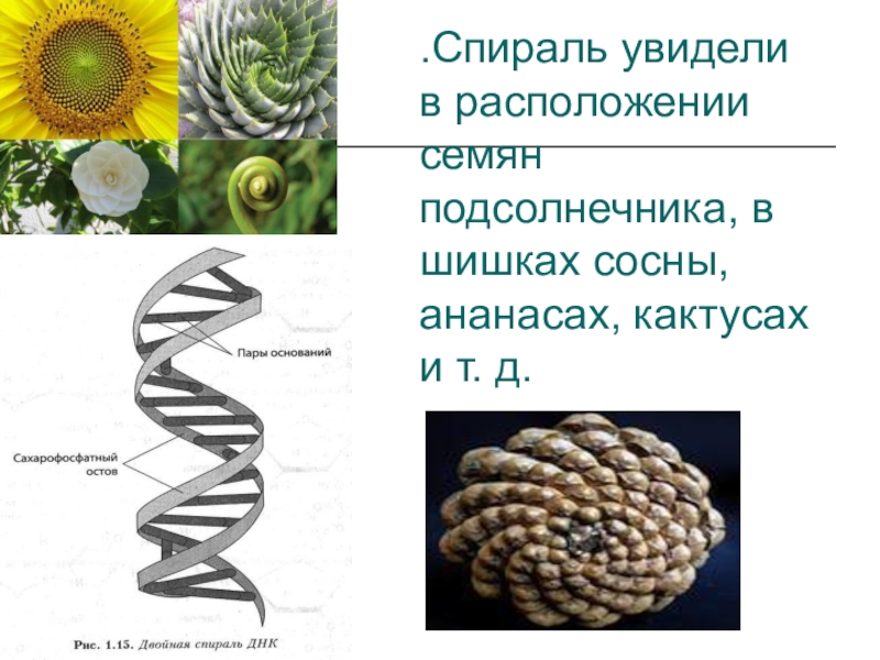 Слайд 11.Cпираль увидели в расположении семян подсолнечника, в шишках сосны, ананасах, кактусах
