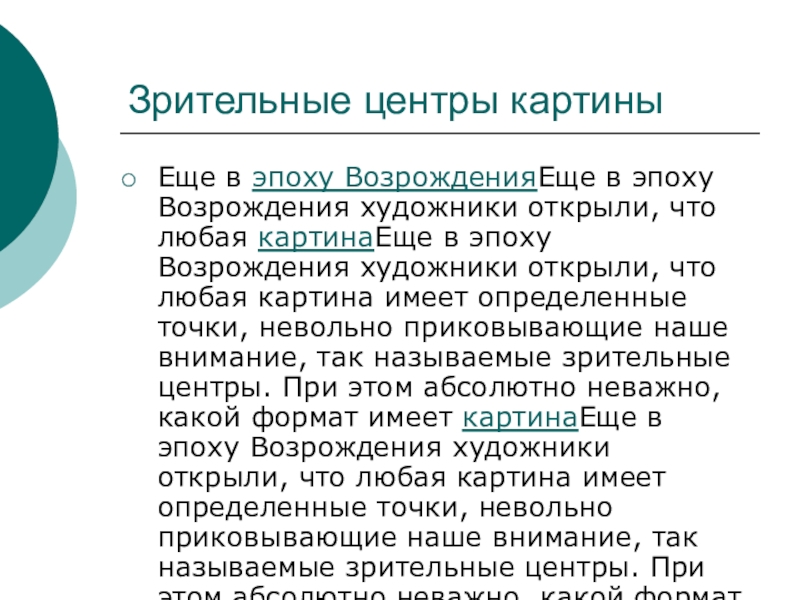 что любая картинаЕще в эпоху Возрождения художники открыли, что любая картина имеет определенные точки, невольно приковывающие наше внимание, так называемые зрительные центры. При этом абсолютно неважно, какой формат имеет картинаЕще в эпоху Возрождения художники открыли, что любая картина имеет определенные точки, невольно приковывающие наше внимание, так называемые зрительные центры. При этом абсолютно неважно, какой формат имеет картина - горизонтальный или вертикальный. Таких точек всего четыре, и расположены они на расстоянии 3/8 и 5/8 от соответствующих краев плоскости.