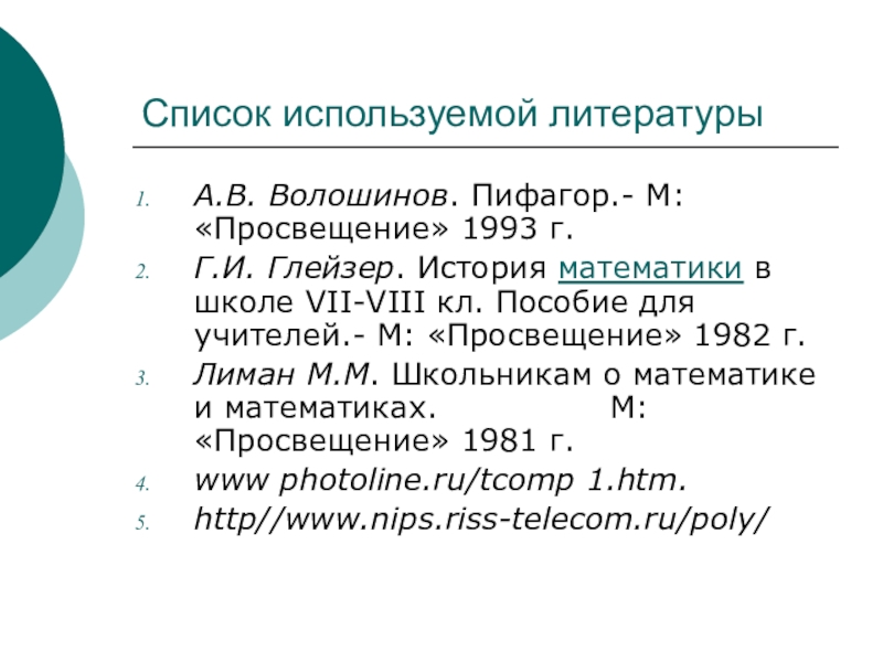 А.В. Волошинов. Пифагор.- М: «Просвещение» 1993 г.