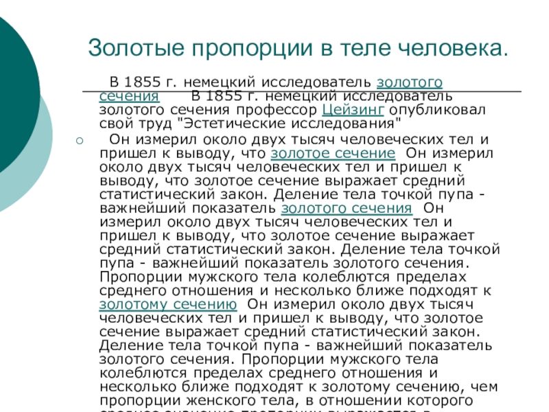 Он измерил около двух тысяч человеческих тел и пришел к выводу, что золотое сечение Он измерил около двух тысяч человеческих тел и пришел к выводу, что золотое сечение выражает средний статистический закон. Деление тела точкой пупа - важнейший показатель золотого сечения Он измерил около двух тысяч человеческих тел и пришел к выводу, что золотое сечение выражает средний статистический закон. Деление тела точкой пупа - важнейший показатель золотого сечения. Пропорции мужского тела колеблются пределах среднего отношения и несколько ближе подходят к золотому сечению Он измерил около двух тысяч человеческих тел и пришел к выводу, что золотое сечение выражает средний статистический закон. Деление тела точкой пупа - важнейший показатель золотого сечения. Пропорции мужского тела колеблются пределах среднего отношения и несколько ближе подходят к золотому сечению, чем пропорции женского тела, в отношении которого среднее значение пропорции выражается в соотношении 8 : 5 = 1,6. У новорожденного пропорция составляет отношение 1 : 1, к 13 годам она равна 1,6, а к 21 году равняется мужской. Пропорции золотого сечения проявляются и в отношении других частей тела - длина плеча, предплечья и кисти, кисти и пальцев и т.д.