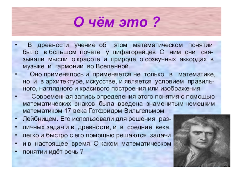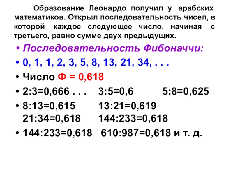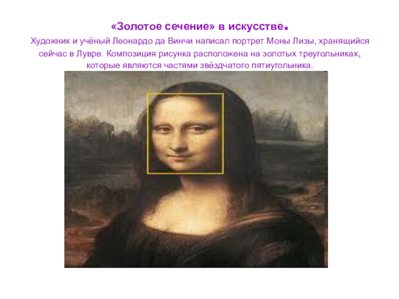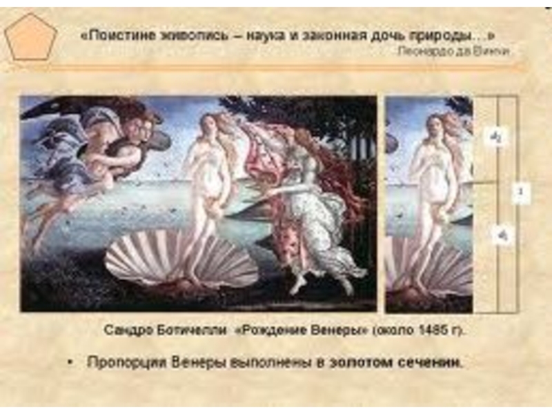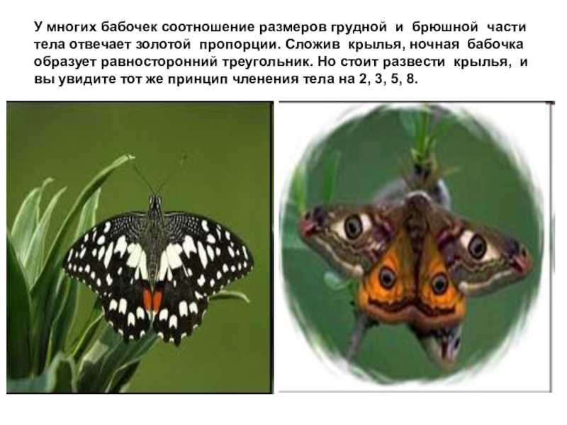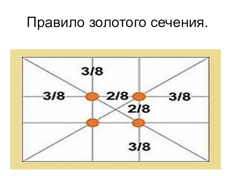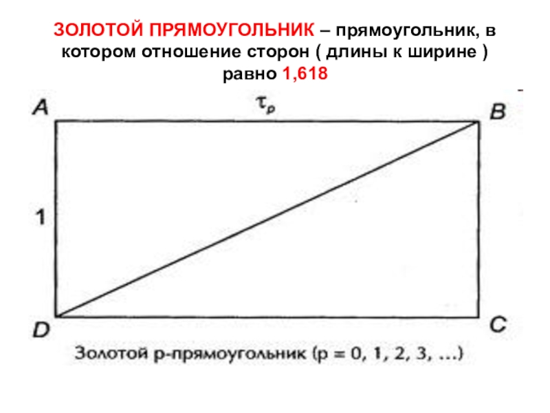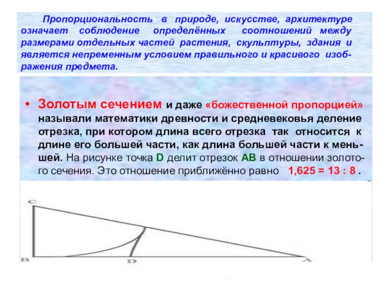Золотым сечением и даже «божественной пропорцией» называли математики древности и средневековья деление отрезка, при котором длина всего отрезка так относится к длине его большей части, как длина большей части к мень-шей. На рисунке точка D делит отрезок АВ в отношении золото-го сечения. Это отношение приближённо равно 1,625 = 13 : 8 .