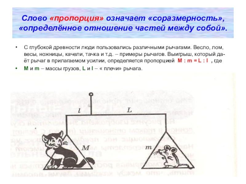 С глубокой древности люди пользовались различными рычагами. Весло, лом, весы, ножницы, качели, тачка и т.д. – примеры рычагов. Выигрыш, который да- ёт рычаг в прилагаемом усилии, определяется пропорцией M : m = L : l , где