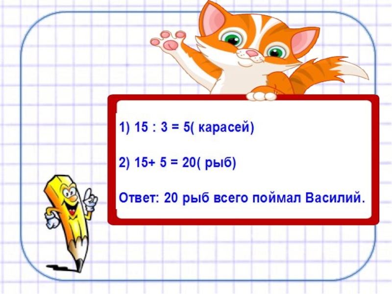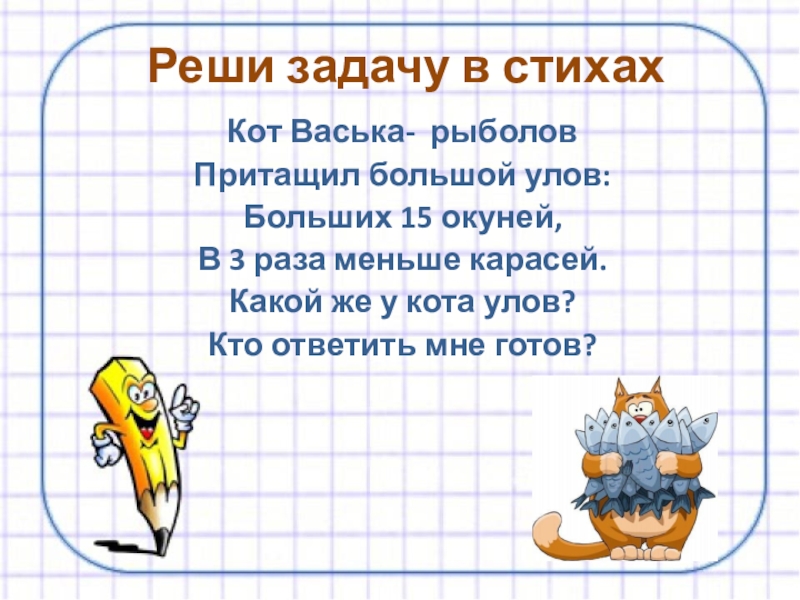 Реши задачу в стихахКот Васька- рыболовПритащил большой улов:Больших 15 окуней,В 3 раза меньше карасей.Какой же у кота