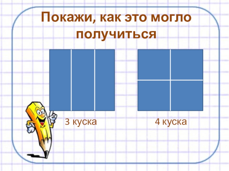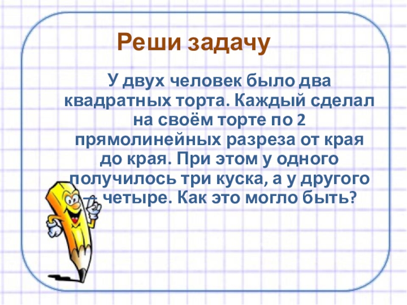 Реши задачуУ двух человек было два квадратных торта. Каждый сделал на своём торте по 2 прямолинейных разреза