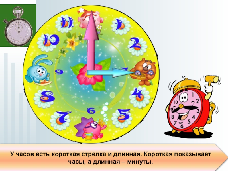 Слайд 6У часов есть короткая стрелка и длинная. Короткая показывает часы, а