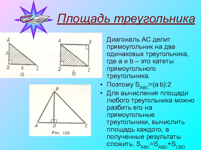 Площадь треугольникаДиагональ AC делит прямоугольник на два одинаковых треугольника, где a и b – это катеты прямоугольного