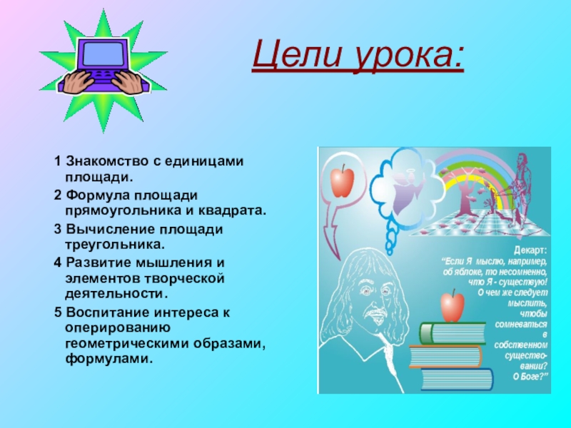 Цели урока:1 Знакомство с единицами площади.2 Формула площади прямоугольника и квадрата.3 Вычисление площади треугольника.4 Развитие мышления и элементов творческой деятельности.5 Воспитание интереса к оперированию геометрическими образами, формулами.