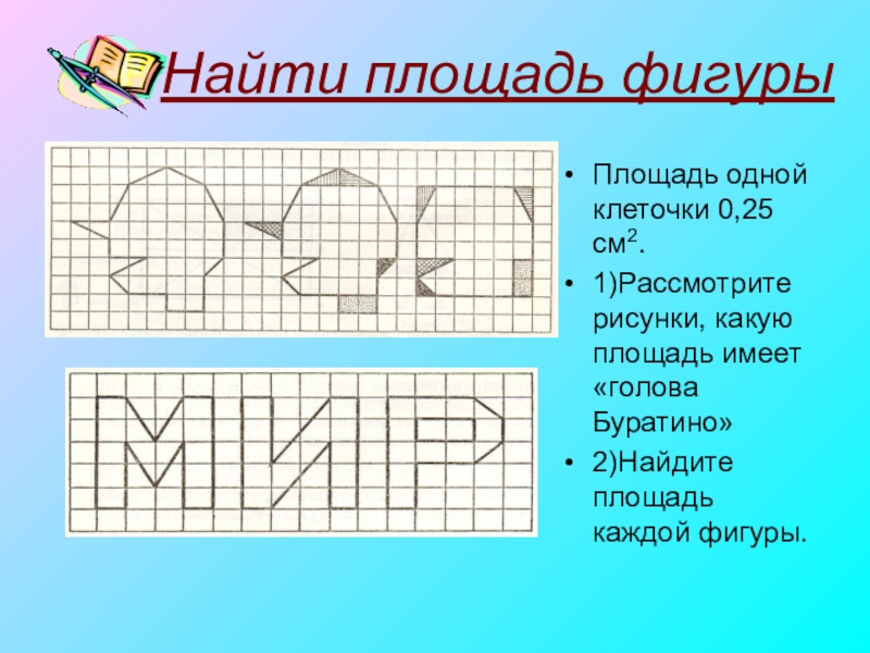 Найти площадь фигурыПлощадь одной клеточки 0,25 см2.1)Рассмотрите рисунки, какую площадь имеет «голова Буратино»2)Найдите площадь каждой фигуры.