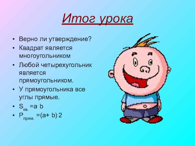 Итог урокаВерно ли утверждение?Квадрат является многоугольникомЛюбой четырехугольник является прямоугольником.У прямоугольника все углы прямые.Sкв. =a. bPпрям. =(a+ b).2