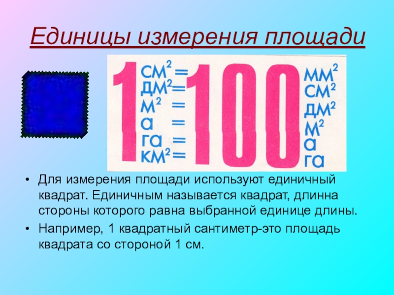 Единицы измерения площадиДля измерения площади используют единичный квадрат. Единичным называется квадрат, длинна стороны которого равна выбранной единице