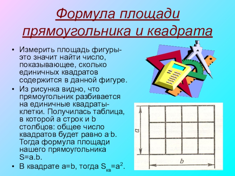 Формула площади прямоугольника и квадратаИзмерить площадь фигуры- это значит найти число, показывающее, сколько единичных квадратов содержится в