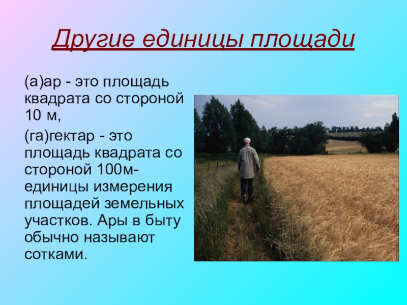 Другие единицы площади(а)ар - это площадь квадрата со стороной 10 м,(га)гектар - это площадь квадрата со стороной