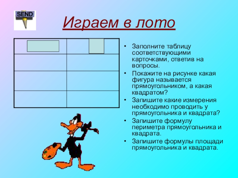 Играем в лотоЗаполните таблицу соответствующими карточками, ответив на вопросы.Покажите на рисунке какая фигура называется прямоугольником, а какая