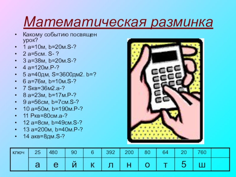 Математическая разминкаКакому событию посвящен урок?1 a=10м, b=20м.S-?