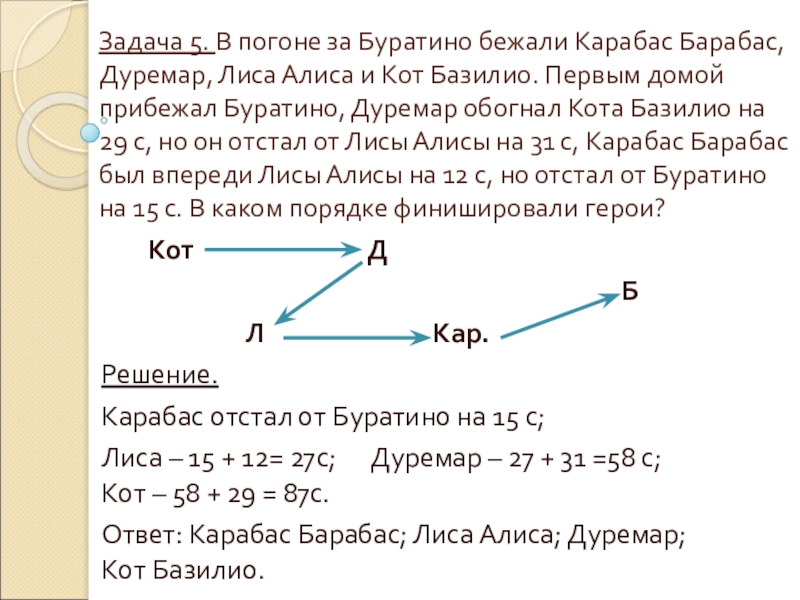 Ответ: Карабас Барабас; Лиса Алиса; Дуремар; Кот Базилио.