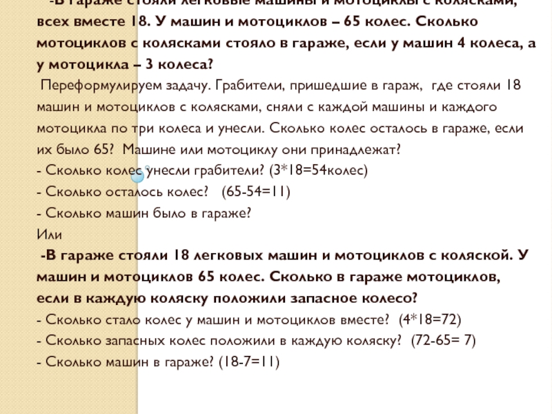 Переформулируем задачу. Грабители, пришедшие в гараж, где стояли 18 машин и мотоциклов с колясками, сняли с каждой машины и каждого мотоцикла по три колеса и унесли. Сколько колес осталось в гараже, если их было 65? Машине или мотоциклу они принадлежат?