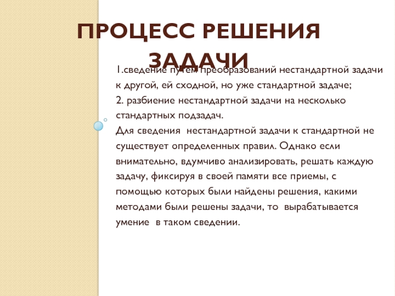 Для сведения нестандартной задачи к стандартной не существует определенных правил. Однако если внимательно, вдумчиво анализировать, решать каждую задачу, фиксируя в своей памяти все приемы, с помощью которых были найдены решения, какими методами были решены задачи, то вырабатывается умение в таком сведении.
