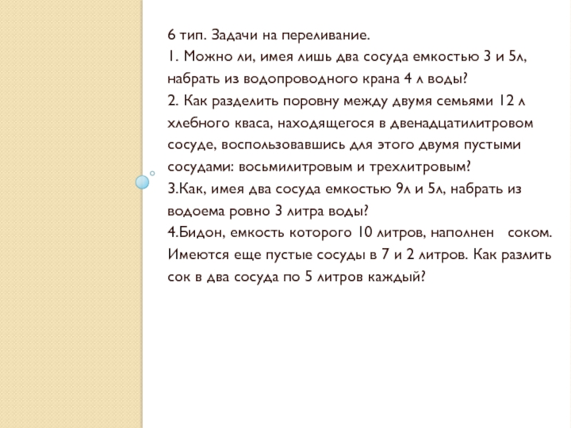 4.Бидон, емкость которого 10 литров, наполнен соком. Имеются еще пустые сосуды в 7 и 2 литров. Как разлить сок в два сосуда по 5 литров каждый?