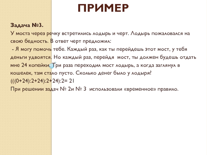 - Я могу помочь тебе. Каждый раз, как ты перейдешь этот мост, у тебя деньги удвоятся. Но каждый раз, перейдя мост, ты должен будешь отдать мне 24 копейки. Три раза переходил мост лодырь, а когда заглянул в кошелек, там стало пусто. Сколько денег было у лодыря?