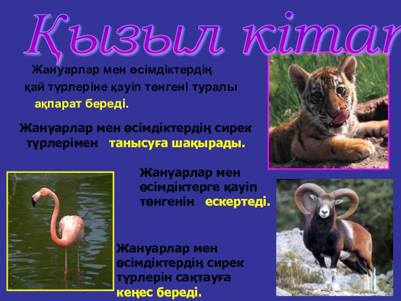 Жануарлар мен өсімдіктердің сирек түрлерімен танысуға шақырады.