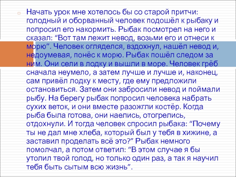 человек подошёл к рыбаку и попросил его накормить. Рыбак посмотрел на него и сказал: “Вот там лежит невод, возьми его и отнеси к морю”. Человек огляделся, вздохнул, нашёл невод и, недоумевая, понёс к морю. Рыбак пошёл следом за ним. Они сели в лодку и вышли в море. Человек грёб сначала неумело, а затем лучше и лучше и, наконец, сам привёл лодку к месту, где ему предложили остановиться. Затем они забросили невод и поймали рыбу. На берегу рыбак попросил человека набрать сухих веток, и они вместе разожгли костёр. Когда рыба была готова, они наелись, отогрелись, отдохнули. И тогда человек спросил рыбака: “Почему ты не дал мне хлеба, который был у тебя в хижине, а заставил проделать всё это?” Рыбак немного помолчал, а потом ответил: “В этом случае я бы утолил твой голод, но только один раз, а так я научил тебя быть сытым всю жизнь”.