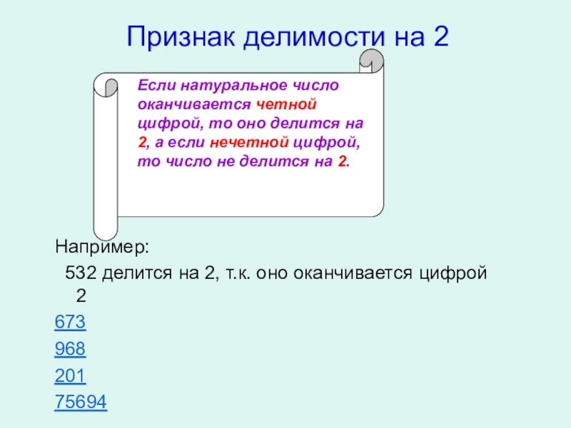 Если натуральное число оканчивается четной цифрой, то оно делится на 2, а если нечетной цифрой, то число не делится на 2.